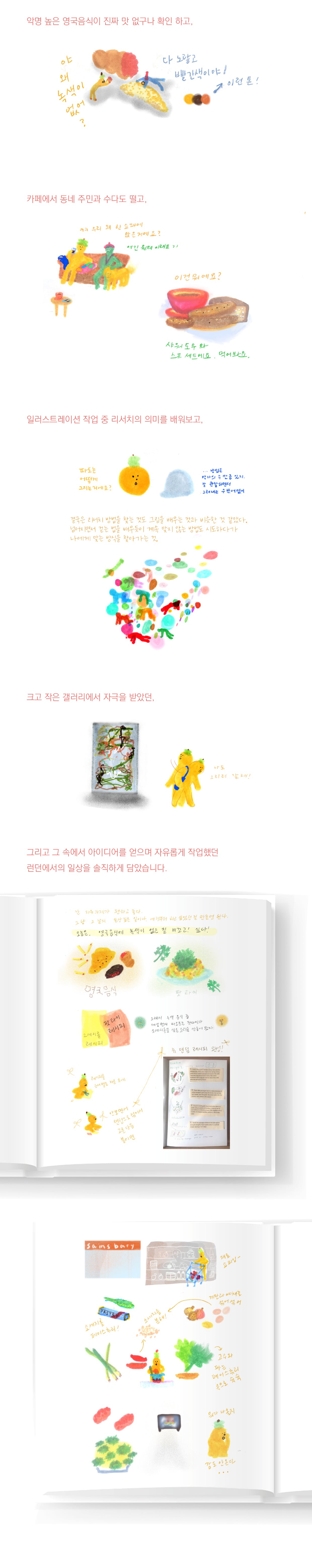 런던 일러스트레이션 & Visual Media 유학 중의 일상과 작업 일지를 만화 에세이로 엮었습니다. F*ckoffee라는 특이한 이름의 작은 카페에서 동네 주민과 사워도우 빵과 야채스프를 나눠 먹고, 영국음식을 먹으며 왜 맛이 없는지 한탄하는 소소한 일상의 재미를 전하고 싶었습니다. 그리고 그 일상에서 원동력을 얻은 작업과정과 사적인 경험을 솔직하게 기록했습니다.